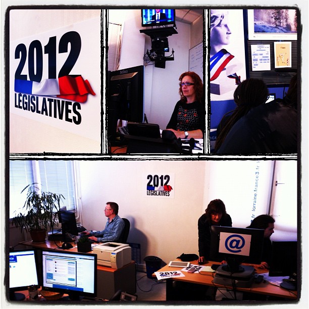 En 2011, nous étions quatre ( notre webéditrice, deux webjournalistes stagiaires et moi), une personne par département qui rentrait dès 20h, les données à la main, par canton, sur le site dédié. Ces données généraient automatiquement l’apparition d’une infographie de résultats par canton. J’assurais en plus le teasing de ces chiffres sur les réseaux sociaux. Un peu plus tard dans la soirée vers 22h, les 1er reportages sortaient du montage et étaient aussitôt mis en ligne par chacun des présents. Par ailleurs, j’ai assuré un direct à 19h dans le JT de Lorraine pour « vendre » notre dispositif web. La soirée s’est achevée avec la mise en ligne d’un article de synthèse par département, anglé sur l’évolution du rapport des forces en présence.